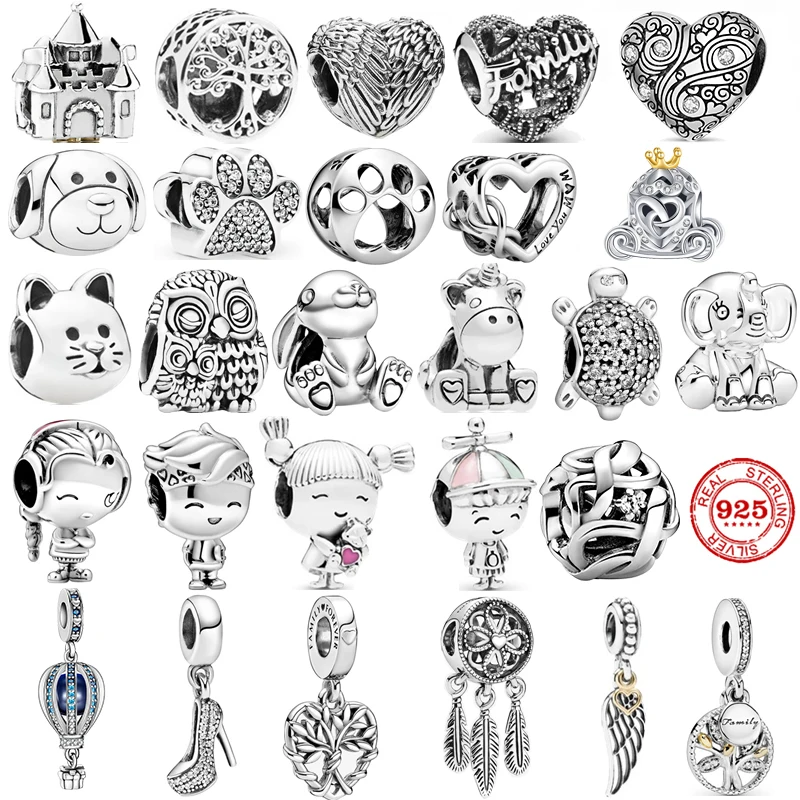 925 스털링 실버 소년 소녀 깃털 고양이 개 패밀리 트리 비즈 핏, 오리지널 판도라 참 팔찌, 여성 DIY 파인 쥬얼리 선물