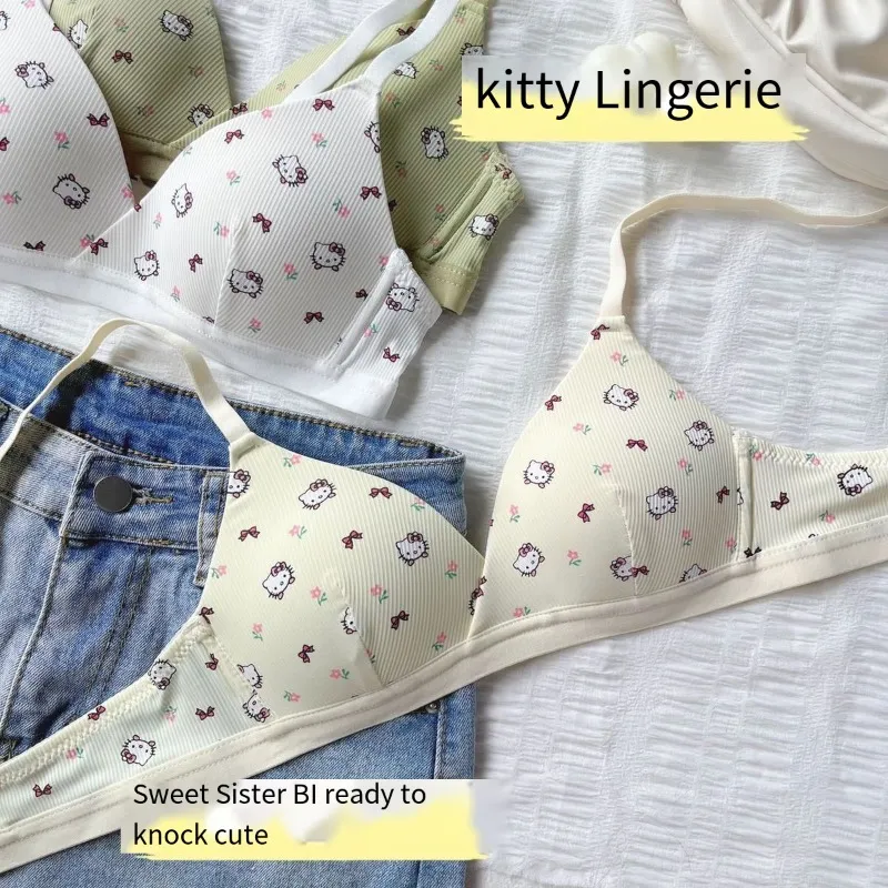 헬로 키티 산리오 여성용 마킹 없는 속옷, 스틸 링 없음, 카와이 소녀 애니메이션 가슴 지지대, 색상 조절 가능, 얇은 브래지어 세트