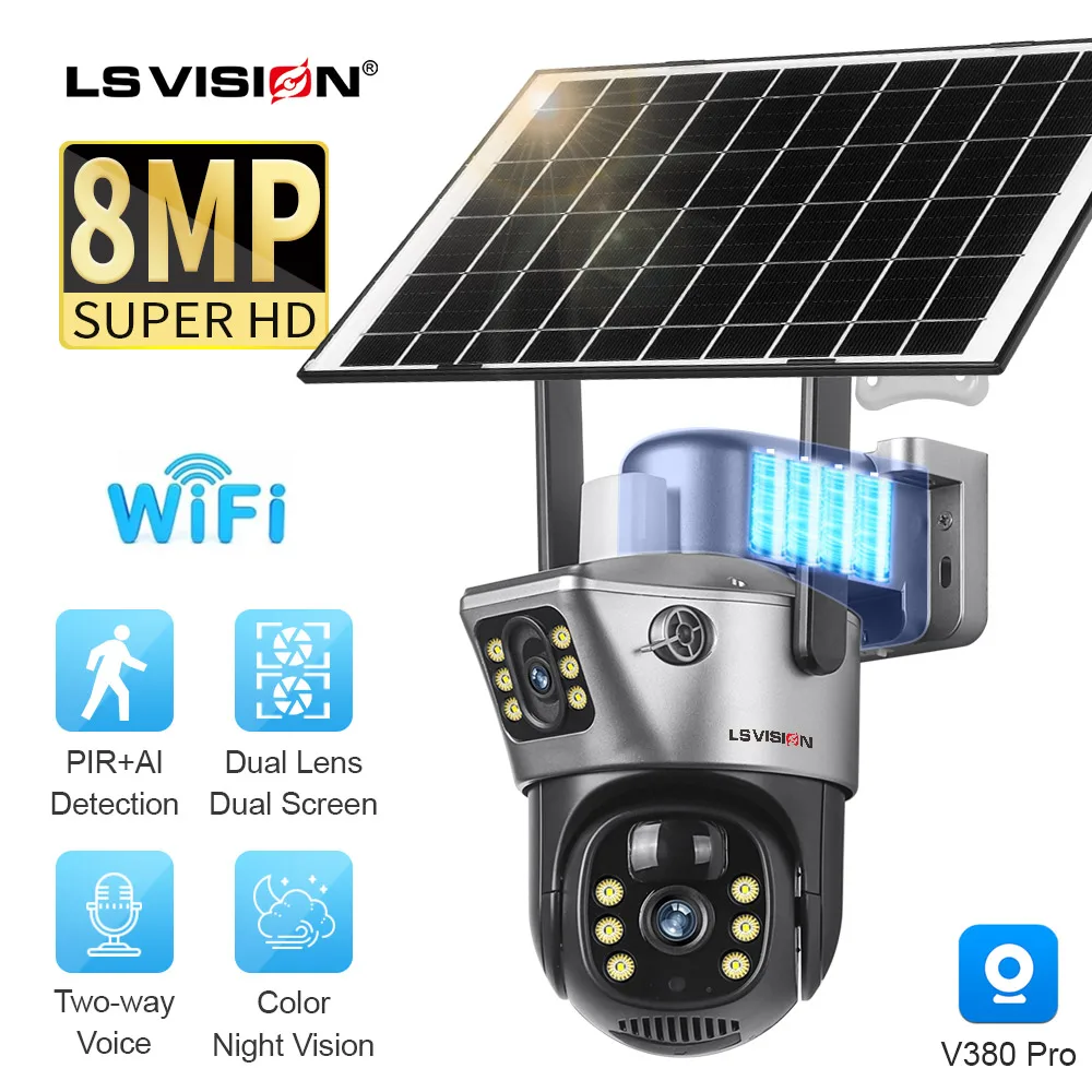 LS VISION 듀얼 렌즈 듀얼 스크린 배터리, 와이파이 태양광 카메라, CCTV 모션 감지, 인간 자동 추적 감시 카메라, 4K, 8MP