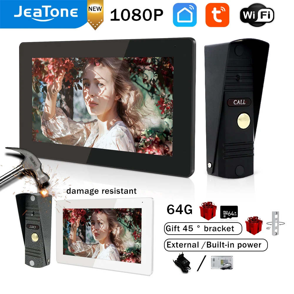Jeatone 와이파이 1080P LCD 터치 스크린 홈 비디오 인터콤 비디오 초인종 카메라, 아파트 투야 스마트, 손상 방지…