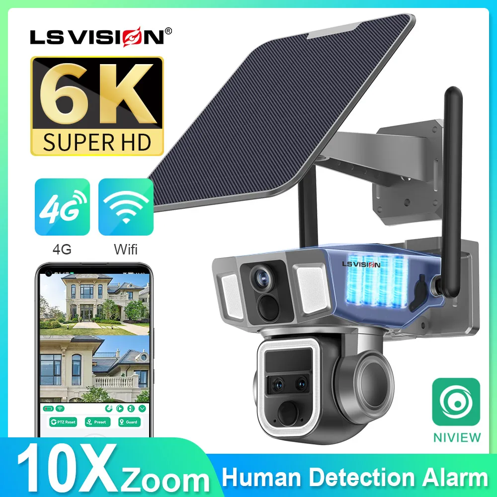 LS VISION 4G 및 WIFI 태양광 보안 카메라, 야외 10X 줌 듀얼 렌즈 스크린, 무선 카메라, 4K/12MP PTZ 캠, 사람 추적 CCTV
