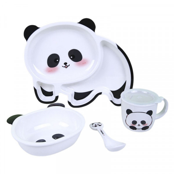 우허 판다 어린이 식기 4종 세트, 접시 + 그릇 + 컵 + 수저, 1개, 블랙 + 화이트