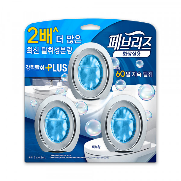 제품명: 페브리즈 화장실용 비치형 강력탈취 플러스 향기: 상쾌한 비누향 형태: 비치형 고체 탈취제 용량: 본품 3개입 사용 기간: 1개당 약 45일 (사용 환경에 따라 상이) 설치 방법: 바닥, 선반 등 평평한 곳에 비치...
