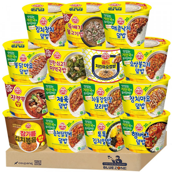 [블루존] 오뚜기 컵밥 20% UP 계란국포함15종 세트(김참+뚝불+매콤낙지+불닭마요+미역국+치킨마요+오삼+진짬뽕+제육+차된+참치마요+김볶+춘닭+김치알밥+햄버그)