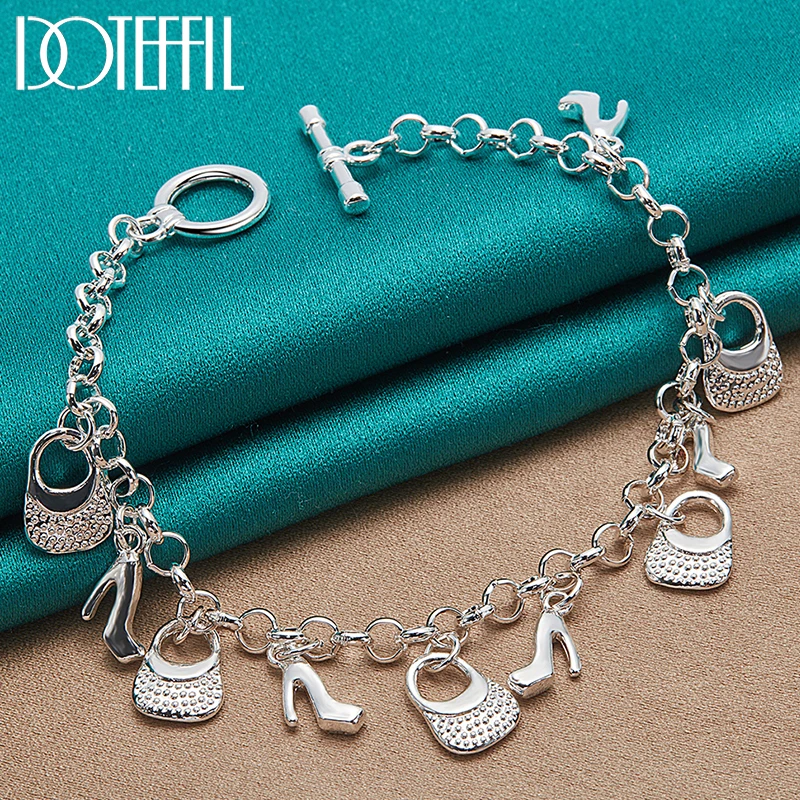 DOTEFFIL 여성용 925 스털링 실버, 24K 골드 하이힐, 가방 펜던트 팔찌 체인, 매력적인 웨딩 약혼 주얼리