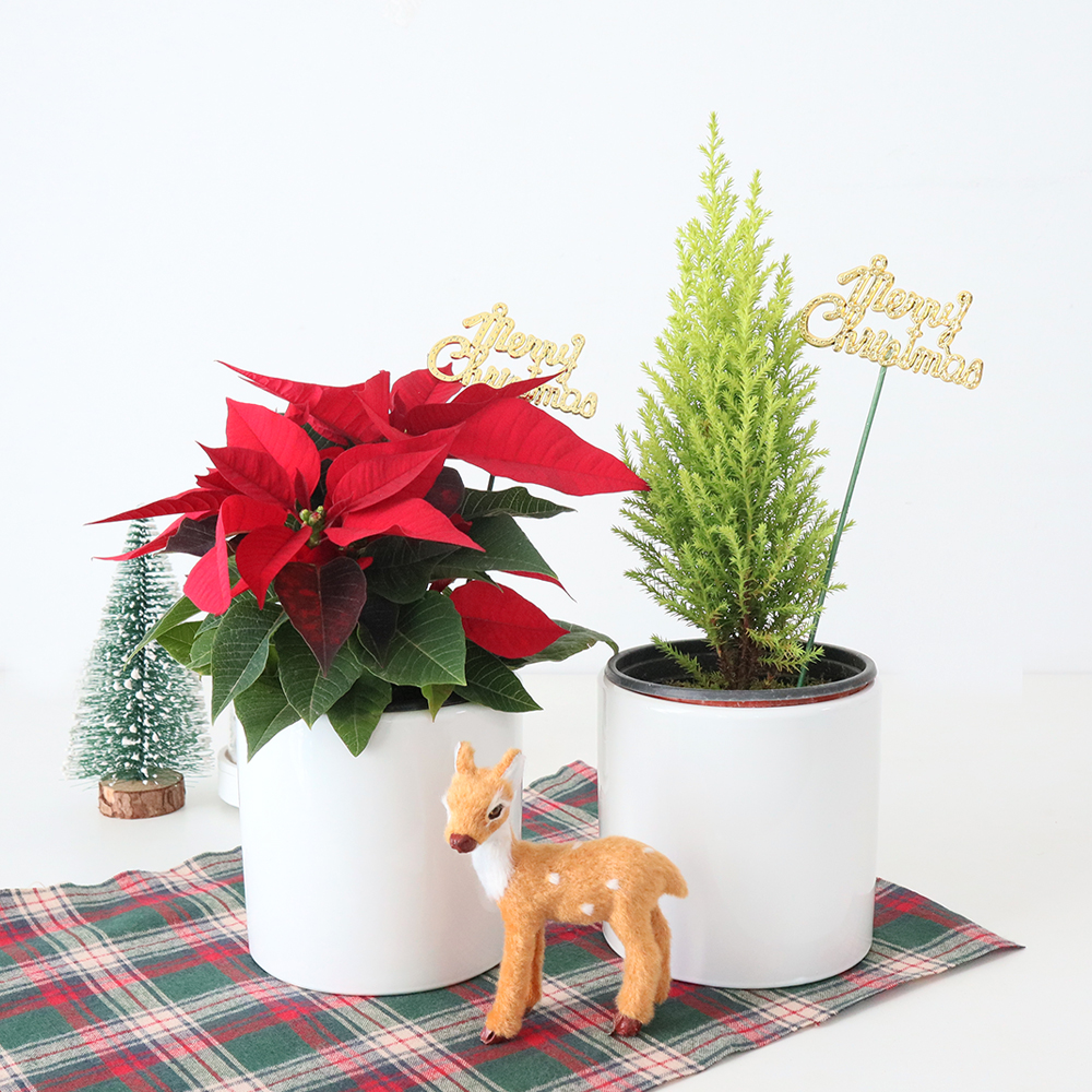 [로켓프레시] 모리앤 크리스마스 포인세티아 + 율마 + 도자기화분 2개입 + 메리크리스마스픽 2개입 + 조명 2개입 세트