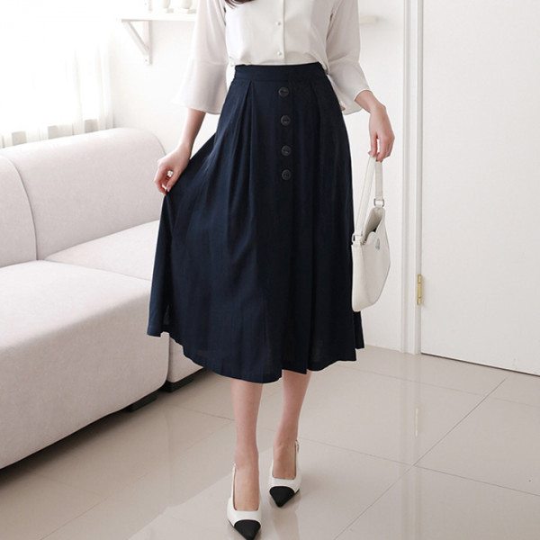 퀸이즈 스텐다드 뒷 밴딩 플리츠 린넨 스커트