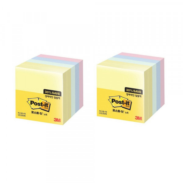 쓰리엠 알뜰팩 포스트잇 76 x 76 mm 654-5A 500p, 노랑, 애플민트, 크림블루, 러블리핑크, 2개