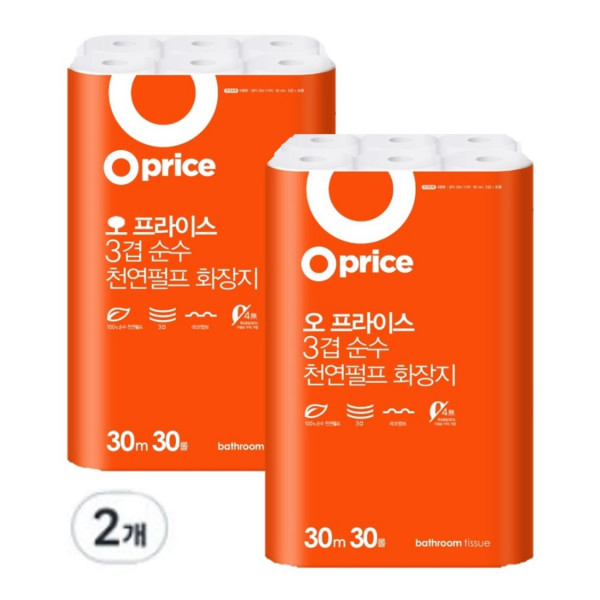 오프라이스 3겹 천연펄프 화장지 30m, 2개, 30롤[22,200원]