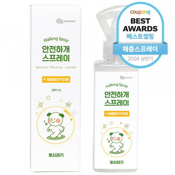그려진 뽀시래기 안전하개 스프레이 한 박스에 200ml 스프레이 1개가 들어있다. 사람보다 피부가 약하고... 스프레이를 뿌리고 나니 해충이 붙을 걱정도 NO!!❌ 여기저기 냄새 맡고 걸어 다니며 안전하게 산책을...