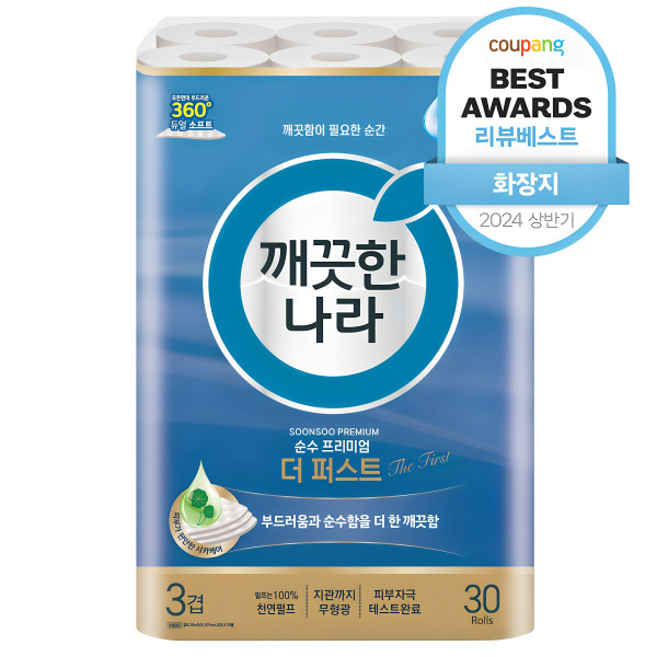 깨끗한나라 순수 프리미엄 더 퍼스트 천연펄프 3겹 고급롤화장지, 30m, 30개입, 1개 구경하러가기