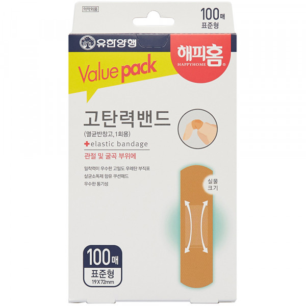 움직임이 많은 관절에 적합 해피홈밴드 '고탄력밴드' 해피홈밴드 고탄력밴드는 탄력 있고 부드러운... 표준형이 100매 들어있는 넉넉한 밸류팩도 준비되어 있어요. 고탄력밴드는 통기성 높은 고밀도 우레탄...