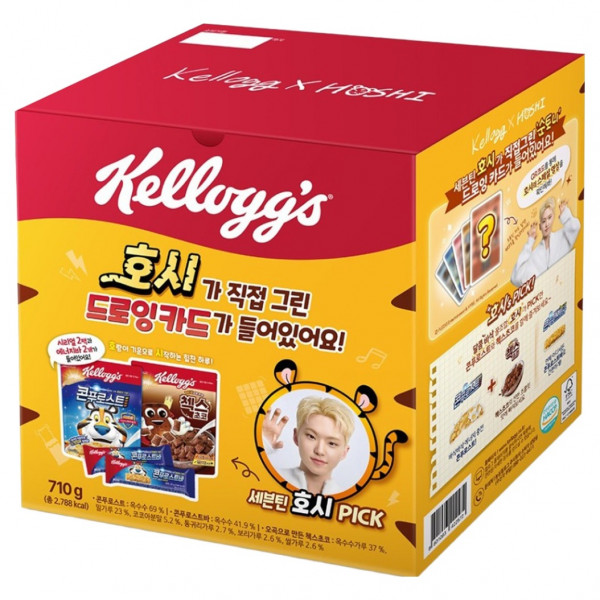 콘푸로스트 300g 첵스초코 340g 콘푸로스트바 2개 그리고 순토니 드로잉 카드까지!! 세븐틴 호시가 직접... 그리고 손으로 가려뒀는데 켈로그 X 호시 콜라보 기획팩를 구매하면 QR로 호시의 스페셜 영상을 보실 수...