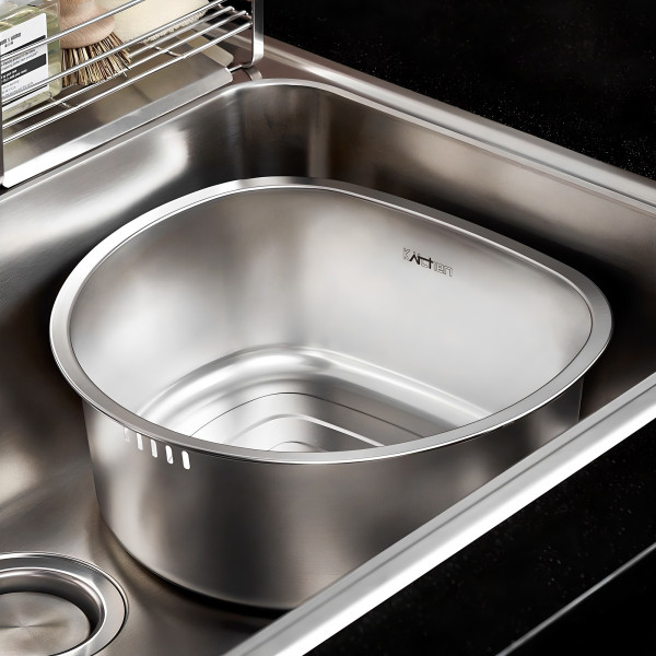 먼저, 키친타월에 식용유를 묻혀 제품 표면을 꼼꼼하게 닦아낸 후, 베이킹소다와 식초를 이용하여... 좁은 싱크대, 반원 설거지통 키친아트 연마제 없는 올스텐 설거지통 반원형 8L는 좁은 주방 공간을 효율적으로...