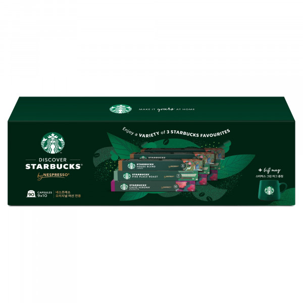 제품 구성 & 가격 "세 가지 맛, 세 가지 매력 오늘은 어떤 커피로 시작할까요?" "신선함 그대로! 2026년까지 넉넉한 유통기한 확인" 상품명: 스타벅스 네스프레소 호환 캡슐 90p + 그린 머그 세트 구성: House...