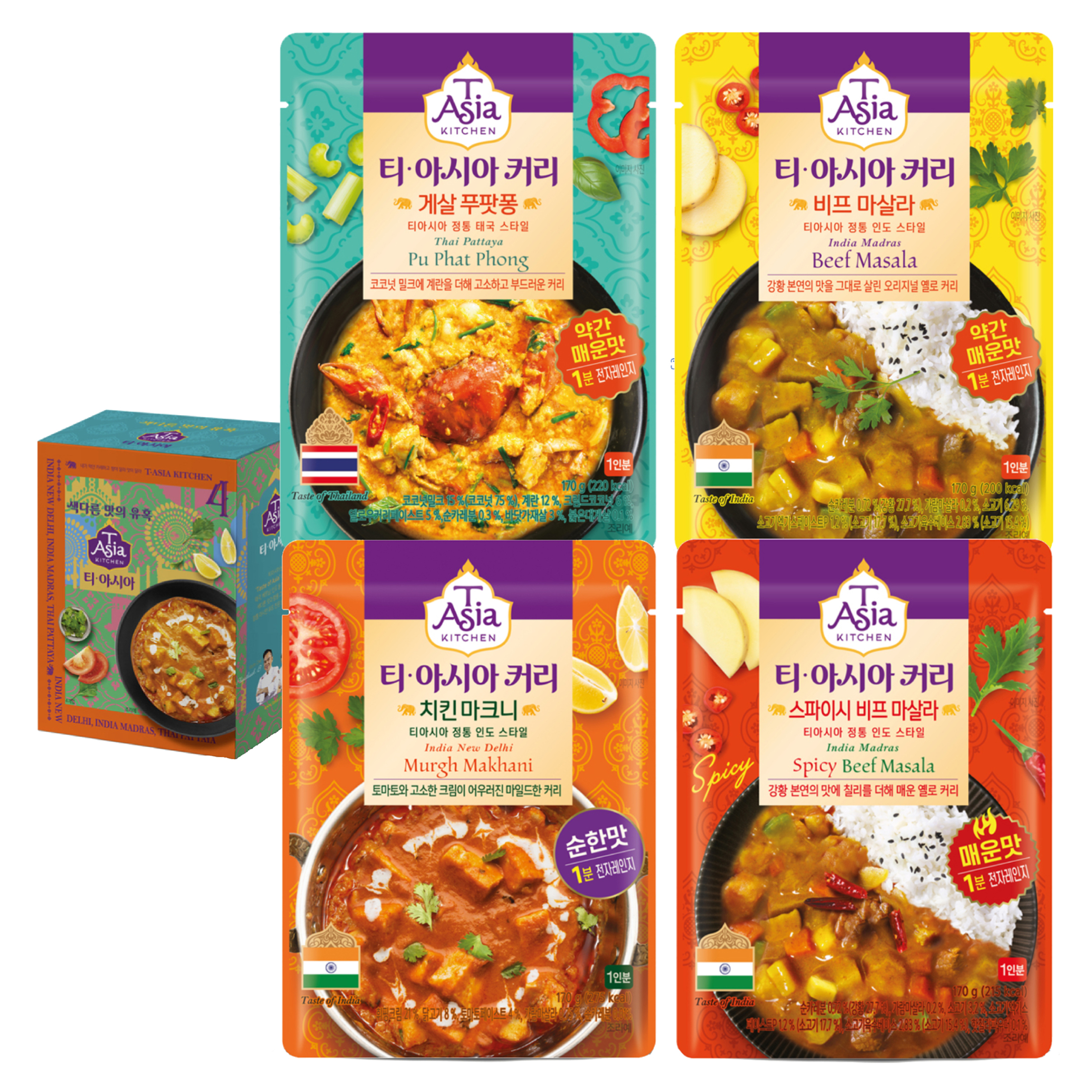 티아시아키친 치킨 마크니 + 게살 푸팟퐁 + 비프 마살라 + 스파이시 비프 마살라 커리세트[7,990원]